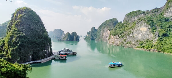 13:00 - You will have time to savor your delicious lunch and enjoy the stunning views as the boat cruises towards the southeast of Halong Bay, passing the famous Fighting Roosters and Finger Islets.